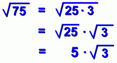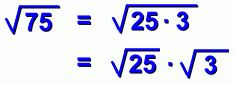 ![]() page three Here's a different radical, also a square root: ![]() We want two numbers which multiply to 75, where one of them is the biggest possible perfect square. Any ideas? With a little practice, you'll remember which numbers will work. Here they are: ![]() These numbers were chosen because the square root of 25 is perfect. Which lets us do this: ![]() The final answer then is: ![]() Because the number under the radical sign is smaller ('3' instead of '75'), the root is considered to be simpler. Here's another one ... |