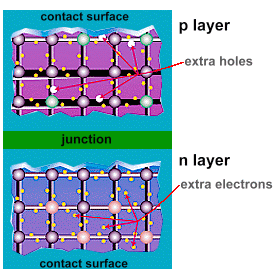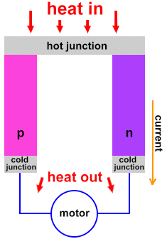 ![]() ![]() ![]() The fan generates its own electricity due to the difference in temperature between the top of the stove and the top of the fan. The base of the fan sits on the hot stove, at a temperature of 65°C or hotter; meanwhile, the top of the fan is much cooler due to the cooling fins, which radiate away heat. When the thermoelectric module in the fan experiences this heat differential, it generates electricity, which causes a small motor to turn the fan. In order to understand the conversion of a heat difference into electricity, we'll look at the thermoelectric module in more detail, and discover how a semiconductor works. A semiconductor is a crystalline metal with impurities added to it. (This is called 'doping'). These impurities can either add free electrons to the substance, or add 'holes' where electrons can be accepted. For example, silicon crystal doped with boron creates an n-type semiconductor with extra electrons; doping it with phosphorus atoms results in a p-type semiconductor that accepts electrons. ![]() ![]() When a temperature difference exists between the two semiconductors, a continuous current is formed in the conductors if they form a complete loop. The heat source drives electrons in the n-type element toward the cooler region, creating a current. Holes in the p-type element will 'flow' in the direction of the current. This current is what powers the motor. ![]() Summary: When two different semiconductors (n-type and p-type) at the same temperature are connected together they establish an electric potential difference, or voltage. When a temperature difference is applied, heat flows across the joined semiconductors; this causes electrons to flow. The resulting current powers the fan's motor. |