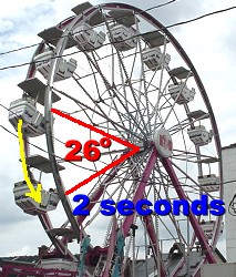 The wheel's radius was approximately 7 metres. The wheel turned slowly ... seats moved from one position to the next in about 2 seconds. So the wheel turns through an angle of about 26° in a time of 2 seconds.