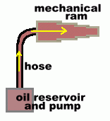 ![]() Hydraulics is the use of a liquid, usually oil, to do work by applying a force. Although air pressure can be used to do the same thing, air won't work for supplying large forces because air will compress, but a liquid won't. ![]() Here is a close-up of the molecules in a gas. They are far apart, which means if you use them to supply a force, they will just compress ... move closer together. Pushing heavy loads with a gas would be like trying to push with a marshmallow ... it would just squish together. ![]() The molecules are already as close together as they can get, under normal circumstances. Pushing with a liquid is just like pushing with a steel rod, as long as you keep the molecules confined (since a liquid has no fixed shape). The advantage of pushing with a liquid in a hydraulic system, instead of steel rods, is that a liquid can bend around corners; it can follow the shape of the hose that holds it. You can supply a push to the liquid in an original direction, and that push will bend itself around corners and go to where you need the force applied.