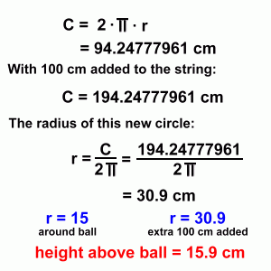 ![]() A String Around Earth: ![]() ![]() Here are the calculations that show the height of the string above the Earth, after you add one metre. We first worked out the circumference of the Earth, which will be the length of the original string. It's 4,007,415,589 cm. Next we added 100 cm, making the length of the string 4,007,415,689 cm. Finally, we solved for the radius of this new bigger circle. When compared to the original radius, you can see that the difference is in fact 15.9 cm. (The value we used for the size of the Earth wasn't precise ... but since the size of the sphere is irrevevant to the answer, we really can use any degree of accuracy we want, as long as we carry enough decimal places to make the difference show up). A String Around a Basketball: ![]() ![]() Here are the calculations that show the height of the string above a basketball, after you add one metre. We first worked out the circumference of the ball, which will be the length of the original string. It's 94.24777961 cm. Next we added 100 cm, making the length of the string 194.24777961 cm. Finally, we solved for the radius of this new bigger circle. When compared to the original radius, you can see that the difference is once again 15.9 cm. (The value for the size of the ball wasn't precise ... but since this number is irrevevant to the answer, we really can use any degree of accuracy we want, as long as we carry enough decimal places to make the difference show up). A String Around Any Sphere: ![]() ![]() We'll make the radius R, and the circumference C. This will be a proof that it works for any values of these measurements. We added 100 cm to the circumference, making the new longer length of the string C+100 cm. Next, we solved for the radius of this new bigger circle. After some simplifying, you can see once again that the new radius is bigger by exactly 15.9 cm. Bcause we did this without specifying values for R and C, it is a proof that it will work for any sphere. |