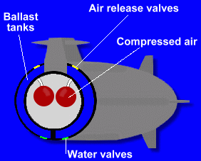 ![]() Once the submarine reaches the depth it wants by flooding the ballast tanks, some air is blown back into them to adjust the buoyancy so that the submarine's overall density is the same as the water around it; this allows it to remain at that depth. While it is underwater, allowing more water into the ballast tanks will enable it to go lower; the displaced air is captured and recompressed to use again.This also means that no bubbles (or noise) will give away the sub's location. |