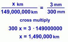 This is a simple ratio question, since the triangles on the left and right are similar.Note that the units on the same side of each side of the proportion (pair of equal fractions) must be the same, but the units can be different on opposite sides. Cross-multiplying and solving gives a result of 1,490,000 km for the width of the sun. How close did we come? Remarkably, with very little effort and not much thought to precision, we obtained a result for the diameter of the sun which is close to the actual value of about 1,390,000 kilometres. We were off by just 7%! |