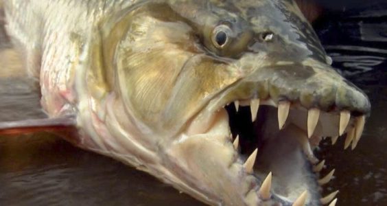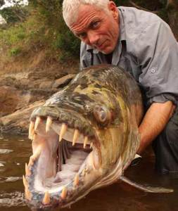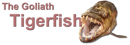 ![]() Forget pirhanas. Never mind the great white shark. This fish is the stuff of nightmares! It is said to be the most dangerous freshwater fish in the world. The Goliath Tigerfish has a mouthful of 32 jagged, razorlike teeth, which are said to be as long and sharp as those of the great white shark's. And unlike the South American piranha, the tigerfish has teeth set right at jaw's edge. These can literally slice prey in half, with one clean, surgical cut. They have a double hinged jaw; this means they are able to open their jaws a lot wider than other fish, and as a result its teeth point further forward when it strikes prey, allowing it to take chunks from their flesh. ![]() This species of Tigerfish, the biggest of the Tigerfish family, is found in the freshwater Congo River Basin in Africa, including Lake Tanganyika and the Lualaba River. Powerful jaws, combined with lightning reflexes and a muscular physique, make the Goliath a lethal hunting machine. It prefers turbulent waters, where its top speed of 40 km/h allows it to target fish that are less powerful swimmers. Goliaths have also been seen leaping out of the water to snag birds in flight. The Goliath Tigerfish is known to attack larger animals, including crocodiles, humans, and of course other fish. The largest ever caught measured 1.5 metres long and weighed 70 kilograms. Locals say it is the only fish that has no fear of the crocodile, attacking and eating the smaller ones. Special organs help it detect small vibrations and its eyesight is particularly good, although attacks on humans could have been the result of mistaking human jewellery or accessories for the flash and splash of smaller fish. Nevertheless, it is the only freshwater fish in Africa with documented attacks on humans. The Goliath Tigerfish has few known predators, due to their size and ferocity, except perhaps for larger crocodiles. However, they are a widely-prized game fish and are therefore hunted by humans. Female Goliath Tigerfish choose riverbanks or lakeshores to lay their eggs. Eggs are laid in underwater vegetation to protect them from predators as the young are not cared for by the parent fish. The females lay a large number of eggs in order to increase the chances that some will survive to adulthood, sometimes up to as many as 750,000.