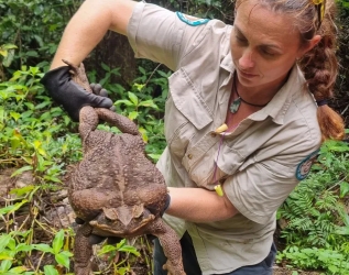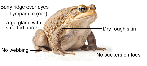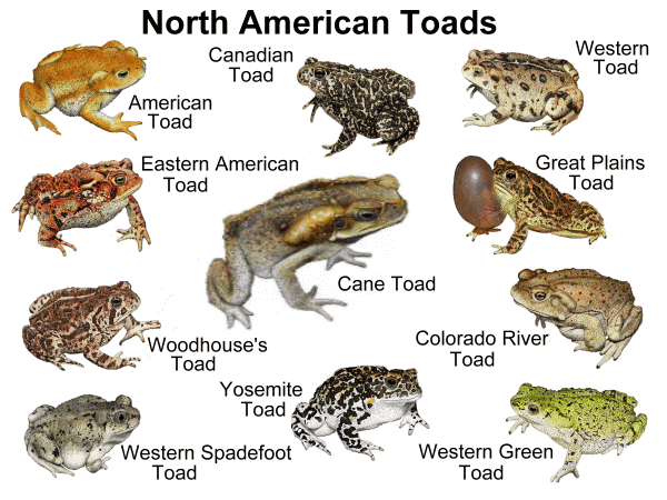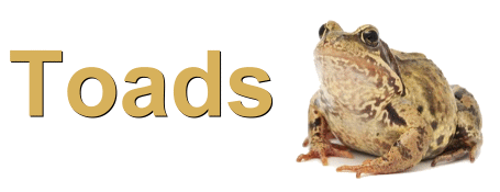 ![]() Like frogs, toads are amphibians. They differ from most frogs because they have dry skin, warts, crests behind the eyes, and shorter legs. Toads crawl, rather than moving in short jumps like frogs. Toads also have parotoid glands, which produce a poisonous secretion that helps the toad defend itself from predators. This substance, called a bufotoxin, can cause death in small animals and allergic reactions in humans. Toads lays their spawn in long strings around aquatic plants. The tadpoles that hatch contain toxins that make them unpleasant for predators to eat, allowing them to survive in deep ponds containing fish, which would eat the tadpoles of frogs. After several months of growth and development the tadpoles sprout limbs and undergo metamorphosis into tiny toads. The juveniles emerge from the water and remain largely terrestrial for the rest of their lives. Toads have camouflage. If they’re brown or green, they can blend into their surroundings and escape detection. If they're brightly coloured, they warn predators to stay away because they’re poisonous. Toads also puff up their bodies in an attempt to look bigger and inedible. Toads mainly feed on slugs, snails and other invertebrates, but larger toads have been known to eat worms and grass snakes, and even mice. The large cane toads will eat anything they can fit in their mouths. Toads hibernate over winter, often under log piles, stones or even in old flower pots! ![]() The smallest North American toad is the oak toad, which is only 3.3 centimetres long. Cane toads are the largest toads; they can be as much as 23 centimetres in length. One massive cane toad caught in Australia, nicknamed 'Toadzilla', pictured below (centre), was described as being the size of a small dog! ![]() ![]() ![]() ABOVE: Oak toad, 'Toadzilla', and another cane toad American Toads are common throughout much of the eastern United States and Canada. Wetland breeding sites include shallow ponds, marshes, and slow-moving streams. Toads will call primarily to attract mates, but they also actively search for females by calling at breeding sites. Females tend to choose males with more 'intense' calls, ones that have higher pulse rates and/or longer duration. ![]() |