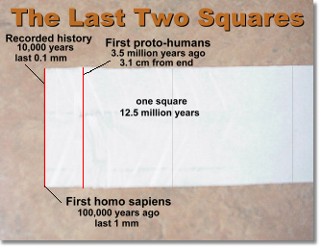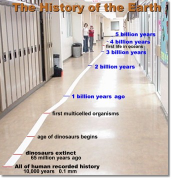 ![]() The earth is over 5 billion years old. Life first originated in the oceans 3.4 billion years ago. The dinosaurs died out 65 million years in the past. Human recorded history stretches back 10,000 years in time. These numbers are too large to visualize, and difficult to compare. Here's an easy way to put time in perspective, and actually visualize different eras in the earth's history. You'll need a roll of toilet paper, a long hallway, and some sticky notes. Unroll the full roll of toilet paper down the hallway. We found that our roll contained 400 squares, and each square was slightly over 11 cm long. (Do all brands have 11 cm squares? Better check this!) The earth is about 5 billion years old. That makes each toilet paper square equivalent to 12.5 million years; each billion years of earth's history takes up 80 squares of toilet paper. On this scale, one year is represented by 0.00000088 cm ... a width too tiny to see. But we can certainly visualize the past 10,000 years of recorded history on this scale, and compare it to the other events in earth's history. Once the paper is completely unrolled, you can mark these important events in earth's history at the appropriate points: