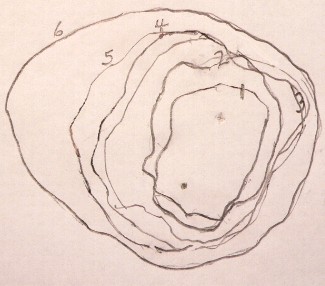 Continue cutting 1 cm off the mountain at a time, and tracing each shape on the map. Remember to line up the holes carefully, and to make sure the cuts are horizontal. Label each traced line '2', '3', etc.