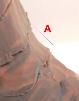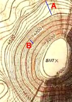 On our map, each line represents an increase in elevation of 1 cm. Have a look at the pictures above. In the picture on the left, you can see an increase in height of 1 cm at a spot where the slope is quite shallow. The side of the mountain isn't very steep ... we labelled it 'A'. Because there is a fairly large horizontal distance covered as you move up the slope 1 cm, the distance between the lines on our map should be large; have a look at region 'A' on the map.