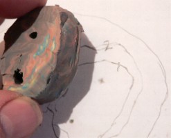 Begin by tracing the outline of the base of the mountain onto the paper. Then press the nails or wire directly down through the mountain so that they make an impression on the paper below. (We put the paper on cardboard to make this easier). The holes and marks will help you line up each slice of the mountain as you trace it.