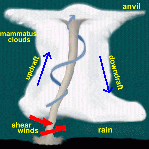 ·The diagram at the left shows a supercell thunderstorm that has generated a tornado. Note the classic thunderstorm shape, and especially the mammatus clouds (shown also in photo below) that are characteristic of tornado-producing storms. Witnesses often describe these clouds as being greenish-blue.