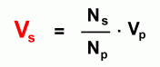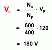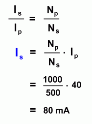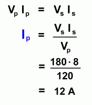 ![]() Example Problem In order to work out problems about how a transformer changes voltage and current, we'll need to develop some equations. Since the voltage is directly proportion to the number of turns, we can write this first equation: ![]() Using symbols, this becomes: ![]() One thing we would like to be able to do is predict the output voltage of a transformer, if we know the primary (input) voltage and the number of turns on both sides. By solving the equation above for Vs, we get: ![]() Let's use this to solve a sample problem: "A step-up transformer has 400 turns on its primary coil and 600 turns on its secondary coil. If the primary coil is supplied with 120 V of alternating current, what will be the secondary (output) voltage?" ![]() Using the equation for Vs , and filling in the other values we see that the output voltage is 180 V. "Continuing the problem, suppose the same transformer produces a secondary (output) current of 8 A. What was the primary (input) current?" ![]() we get the first equation at the left which can be solved for Ip. Filling in the corresponding values gives an answer of 12 A for the primary current. Notice that this is a step-up transformer. The number of turns on the right is 1.5 times as large as the number on the left. As a result, the voltage went up by a factor of 1.5 (from 120 V to 180 V), and the current was reduced by a factor of 1.5 (from 12 A to 8 A). Another problem: "A transformer with 1000 turns on the primary coil and 500 turns on the secondary coil has a primary (input) current of 40 mA. What will be the secondary (output) current?" ![]() Because current is inversely proportional to voltage, we get the first equation, relating secondary and primary currents to the primary and secondary number of turns. Solving for Is and filling in the remaining values gives an answer of 80 mA. This was a step-down transformer, which decreases the voltage. But by cutting the number of turns in half, we doubled the current. ![]() |