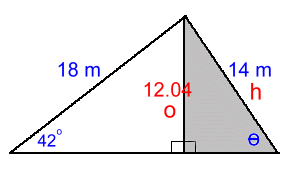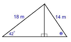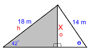 No word problem this time, just a diagram. The goal is to find the value of θ to the nearest whole degree. Because the entire triangle does not have a right angle, we'll have to solve this in two parts. Let's solve the left triangle first. We'll solve for the side in the centre, marked 'X' and then use that value in the triangle on the right to find θ: