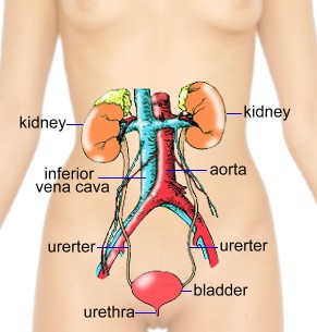 ![]() The urinary system is composed of organs, tubes, muscles, and nerves that work together to dispose of wastes in the body, and to help keep the chemicals and water in your body in balance. The urinary system includes two kidneys, two ureters, the bladder, two sphincter muscles, and the urethra. Your body absorbs nutrients from the food you eat. What's left is waste, and is left behind in the bowel and the blood. The urinary system removes a type of waste called urea from your blood. Urea is produced when foods containing protein, are broken down in the body. Urea is carried in the bloodstream to the kidneys. The kidneys are organs about the size of your fists, and are are near the middle of the back, just below the rib cage. The kidneys filter urea from the blood, while about 99% of the fluid in food is returned to the body. The kidneys allow the blood to keep glucose, salts and minerals. After the urea has been filtered out it is mixed with water and other waste substances (excess salts and organic materials) and becomes urine. The waste-containing urine is sent from the kidneys down two thin tubes called ureters to the bladder. Muscles in the ureter walls repeatedly contract and relax to force urine downwards. Small amounts of urine are emptied into the bladder from the ureters about every 15 seconds. The bladder is a hollow organ shaped like a balloon. It sits in your pelvis where it is held in place by ligaments attached to the pelvic bones. The bladder stores urine until you are ready to empty it. It swells into a round shape when it is full. In a healthy urinary system, the bladder can hold up to half a litre of urine comfortably for several hours. Circular muscles called sphincters help keep the urine from leaking out; they close tightly like a rubber band around the opening into the urethra. When you urinate, the brain signals the bladder muscles to tighten, squeezing urine out of the bladder, and also signals the sphincter muscles to relax. Urine exits the bladder through the urethra, a tube which exits at the vagina (in females) and through the penis (in males). Adults eliminate about a litre and a half of urine each day, although this can vary depending on how much fluid you have taken in and how much you've been sweating. The body also uses the kidneys to keep the amount of water in your body in balance. If you've been drinking lots of liquids and have excess water, it will be passed out in the urine, making the urine very pale in colour. Alternately, if you haven't been drinking enough fluids, the kidneys will conserve water by mixing less into the urine, making it appear dark yellow. Urine is sterile and nearly odourless when it leaves a healthy body. But once outside, urine is quickly contaminated by bacteria which convert chemicals in the urine into other chemicals that have a distinctive odour, one of which is ammonia. Some diseases alter the characteristics urine. For example, sugar in the urine is a sign of diabetes. Problems in the urinary system include kidney failure, urinary tract infections, kidney stones, prostate enlargement, and bladder control problems. Kidney failure is not necessarily fatal; less than half of one single kidney can do all the work that two kidneys usually do. Interesting Urine Facts: