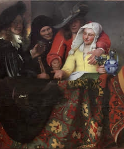 Vermeer, like Rembrandt, was a master of chiaroscuro effects This means using strong contrasts between light and dark, which can give subjects volume and three-dimensional qualities. Have a look at the painting 'The Procuress' below for a good example of this technique.