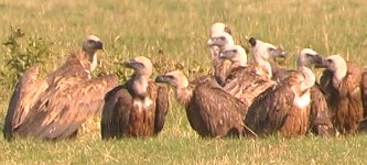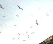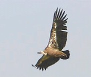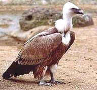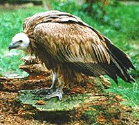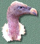 'Vulture' is the common name for carrion-eating birds. There are two varieties ... the American and the Eurasian/African vulture. There are many differing species within each group, but all vultures are large birds with a naked head and hooked bill. They feed almost entirely on dead animals, but will occasionally attack newborn or wounded living animals. Most vultures hunt by sight, soaring high in the sky, and descending to feed. Its beak is short with a down-curving pointed end; its long neck is thinly covered with down with a collar of feathers at the base. The Griffon vulture feeds mostly on large dead mammals. When it finds a carcass, it will eat primarily the muscle meat and viscera. The vulture's crop and gizzard can hold over 6 kg of meat at once. Vultures lay one egg each mating period; the babies are covered with pale brown down, but start to resemble an adult vulture after 3-4 months. The life span of a Griffon vulture is thought to be about 40 years. Unlike American vultures that rely on a sense of smell, Griffon vultures use their keen eyesight to search for food ... a rotting carcass, or perhaps just other vultures circling a meal they've found. Because they get very bloody when eating, they like to keep clean ... dozens of griffon vultures gather by pools of water to bathe, and then stand with wings extended to dry out. When one vulture finds a carcass, others see it and congregate. Many vultures may circle above, waiting around a kill for a chance to feed. The Griffon vulture's beak is not very strong, so it must also wait for other smaller vultures, or animals, to tear the carcass open, before it can itself eat. Populations of vultures are declining in many places, and particularly in Africa, due to loss of habitat and persecution by humans. However, there are efforts underway in many countries to help bring back the Griffon vulture population. |