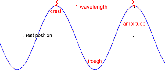 One wavelength λ is the distance between crestsThe amplitude is the height of the wave above the rest position The frequency f is the number of full wavelengths that pass by each second The speed v of the wave is usually measured in metres per second Speed, frequency and wavelength are related by the equation: v = f · λ where v = wave speed f = frequency λ = wavelength An example: An ocean wave has frequency 2 waves per second and wavelength 5 metres. Find its speed. v = f · λ v = 2 waves/second x 5 metres/wave v = 10 metres/second NOTE: We use the word 'speed' here, when it more properly should be called 'velocity', as the movement of waves has a direction. We're ignoring the difference here, since a wave's direction is not pertinent to the properties of waves. |