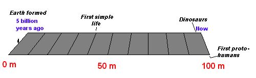 ![]() It is not easy to visualize times that stretch over billions of years. The numbers are so big that they don't mean anything! Instead, let's look at an analogy that might help to bring the enormous time frame of the universe into perspective. The earth was formed 5 billion years ago. Imagine that the length of time from then until now is represented by the length of a football field, 100 metres. You are at one end. ![]() On this scale, the first simple life forms, multi-celled organisms in the ocean, appeared at about the 40 m line. This was 3 billion years ago. Next came the first primitive fish (still no land life) at the 92 m line, or 425 million years ago. The dinosaurs flourished about 140-200 million years ago...this is at about the 95 m line. The first primitive ancestor of humans appeared about 5 million years ago. On our football field, this happens merely 10 centimetres from the end line! All of recorded history, the last 5000 years or so, takes place in the last tenth of a millimetre. Your lifetime, assuming you are less than 50 years old, happens in the space of only one two-thousandth of a millimetre, too small to see without a microscope, right at the very end of the field. |