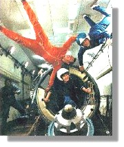 I'm sure you've seen astronauts in the Shuttle, on T.V., and marvelled at how they seem to float around,... almost as if there were no gravity! Have you ever wondered about the things they never show on TV... like, what happens if somebody throws up? How do they go to the bathroom?? Believe it or not, these are actually important questions; they pose problems that scientists have been working on for a long time. Before we show you their answers, we need to clear up a very common misunderstanding. When an astronaut in orbit is seen to be floating around his spacecraft, he is indeed 'weightless', if you mean by this, 'He would weigh nothing if he were standing on a bathroom scale'. But it is wrong to say that the force of gravity on him is zero, or that 'there is no gravity'. Gravity is still there, and it's just about as strong as it is on the surface of the Earth. He is 'weightless' the same way you would 'weigh nothing' if you jumped out of an airplane and were falling freely toward the ground. If a bathroom scale was falling freely beside you, and you tried to stand on it, it would register your weight as zero, because it's falling too. But both you and the scale are still under the pull of the earth's gravity. The force of gravity isn't zero, just the weight In the space shuttle, both the shuttle and the astronauts were falling freely around the earth. That's what an 'orbit' is. Imagine you were inside a big box that someone pitched out of an airplane. You would be floating around inside the box as you and it fell together. Rather than saying the astronauts are 'weightless', it makes more sense to say they are 'continuously falling'... from a height so great that the earth 'curves out of the way' underneath them, so they never hit the ground! The force of gravity at their height above the earth is only slightly less than it is right here on the surface! Actors (including Tom Hanks) in the movie 'Apollo Thirteen' underwent this procedure in order to film the 'weightless' scenes in the movie. The actors ended up having more time 'weightless' than many former astronauts in space ever did! Astronauts often get sick the first time they experience 'weightlessness'. Some always get sick. This can be very unpleasant in the close confines of a spacecraft, since everything floats around, including the vomit! It tends to congeal into large spherical globules that float around the cabin with the air currents. Aside from the unpleasantness of breathing in the stuff, or having it float onto your sandwich, astronauts also have to prevent it from gumming up or shorting out the equipment. The mess is very quickly cleaned up with a vacuum cleaner... which is perfect for sucking errant bits of stuff out of the air! A liquid that the astronauts want to drink, water for instance, can be slid out of its container, where it will hang in the air in a big 'blob'. It can be sucked up with a straw inserted into the 'blob' of water! But to prevent water droplets from shorting out the equipmant, astronauts drink from plastic bulbs with an attached straw. Just like the kind your baby sister uses! ![]() The Shuttle's facilities were a little more up-to-date... but not much. Essentially the urine collection was done the same way, except that you could go to the tube (you didn't wear it). Solid waste was collected by something that acted much like a real toilet, except the waste and flushed water were vacuumed away. It did plug up occasionally. Facilities on the International Space Station are similar. Probably the first real toilet will have to await the construction of a large, rotating space facility, where rotation causes a centripetal force that simulates gravity. Imagine a tiny 'you' standing on the bottom of a bucket that someone is swinging around their head. You would feel 'heavy' in the direction of the bottom of the bucket. Amusement park ride builders know this. Such rotating 'space stations' might supply a sort of 'gravity' for your toilet... but then you'd have the problem of Coriolis forces... |