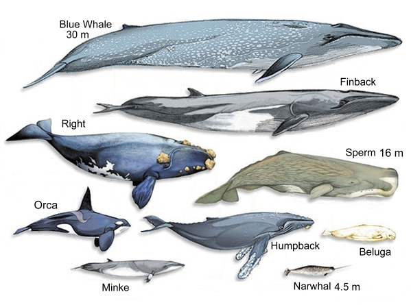 ![]() Whales are aquatic mammals belonging to the order Cetacea. The term 'whale' can be used in reference to any cetacean, including porpoises and dolphins, but in general it is applied only to those more than 3 metres long. Whales are the heaviest known animals, present or past, reaching maximum size in the blue whale at more than 30 metres and 200 metric tonnes. Large predatory whales, including the killer whale, are often considered to be apex predators, with no natural predators or enemies in their marine environments. ![]() Whales are found in all of the world’s oceans. They are mammals, and they share the defining traits of that group: they breathe air, are warm-blooded, give live birth, suckle their young on milk, and have hair. All are entirely aquatic, but must surface regularly to breathe. Blubber serves as an insulating layer to protect small whales from hypothermia. Whales use sound to perceive their environment and to communicate, sometimes over great distances. Biologists have determined, for example, that the 10-Hertz sounds of Fin whales can travel over 1,800 km. Toothed whales can produce sounds and interpret their reflections via active echolocation.