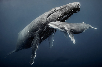 Female whales are pregnant for about a year. The young are relatively large when born, one-third to one-half the length of the mother, and are able to swim at birth. They are nursed for about six months on extremely rich milk that can contain as much as 50 percent fat. A nursing Blue whale calf, for example, puts on about 80 kg a day. Females produce milk from the fat reserves under their skin. Whale mothers are protective of their calves and stay close to them for about a year.
