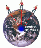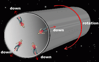 Things get even more interesting when we simulate gravity by rotating a space station. Centripetal force caused this way imitates gravitational force. On the inside, the rotation causes a person to move outwards, and the floor provides the equal and opposite force. This makes 'down' perpendicular to the floor, wherever you are on the inner floor.A large enough cylinder constructed this way and caused to spin could allow everyone inside to experience simulated gravity, rather than the usual weightlessness of space. People living and working on the inner side will look up and see others above them, upside down, walking around and working comfortably. In this situation, 'down' is always 'outwards towards your feet'. The ultimate description of such an incredible feat of engineering is described in the award-winning novel 'Ringworld' by Larry Niven. |