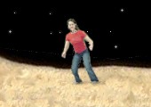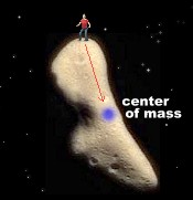 The force of gravity exists where there is mass. It is not a very strong force, which may surprise you ... until you consider that it takes the entire mass of the Earth to hold you to its surface, but you can break contact easily by jumping. Smaller masses cause less gravity. If you were standing on the surface of the moon, you would experience a force of gravity only one sixth of what it is on Earth. You would weigh only a sixth of your Earth-normal weight. If you were standing on tiny Eros, an asteroid a mere 34 kilometres long, the force of gravity would only be one thousandth of Earth's gravity. You would easily be able to jump into space. But this gravity is still enough to make you feel 'down' when standing on it, and to make rocks on the surface roll downhill.