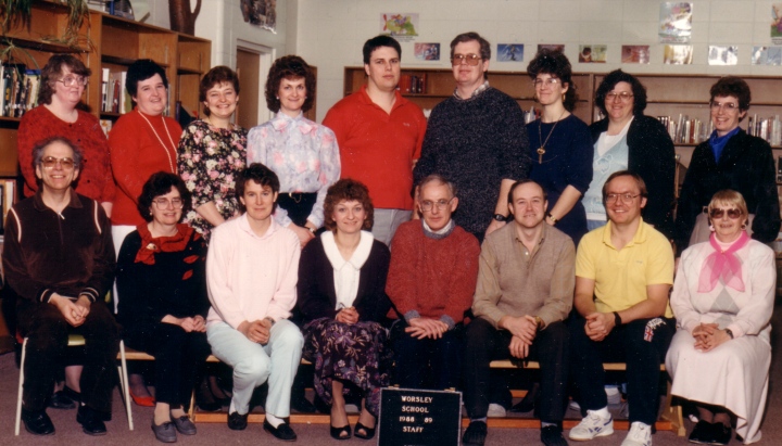 Front row: Jerome Cherry, Martie Thompson, Sandra Wasylciw, Marilyn Demetroff, Reg MacDonald, Brian Mack (principal), George Stewart, Dorothy Sudnik