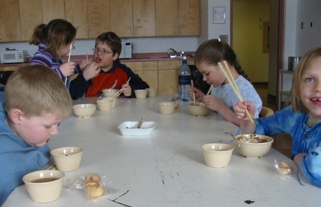 To mark the end of their studies on China, the Grade 1/2 class enjoyed a Chinese meal. The Grade 3 class helped prepare the food, and assisted the Grade 1/2 students with using chopsticks. Everyone thoroughly enjoyed the meal.