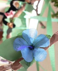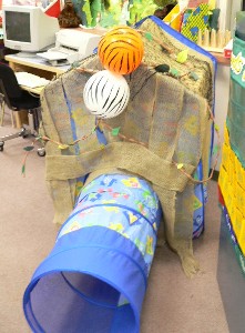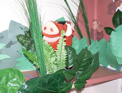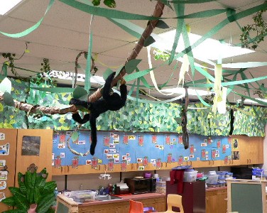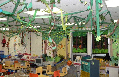 One day when they walked into their classroom, they discovered that it had been turned into a jungle, complete with vines, blooming flowers, trees, grass, a jungle tent, insects