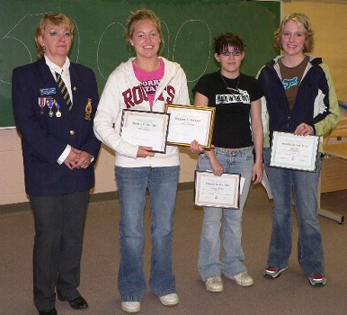 The Royal Canadian Legion, represented by Marg Saunder at the left, presented awards to three Worsley School Senior High students on June 3rd. Priscilla took second place in our Zone for the best Senior Remembrance Day poem; she also captured second place at the District level. Danielle took first place in the Senior Division for her Remembrance Day poem. Kristi won first place in the Senior Black and White Poster Division. Congratulations to all our Worsley School winners!