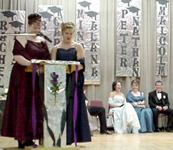 Our favorite memory of Rachel happened in Grade one. Remember that, Rachel? I bet Justin does! It was the time you snorted crackers out your nose and all over him, after you laughed at one of his jokes! And we will never forget Arron for his caring but quiet attitude, and how it seems that he is good at just about every sport he plays. Our fondest memory of Justin would have to be in grade 3, when he got glasses, and thought he was the COOLEST because they had the Super Mario Brothers on them! Mindy has done some pretty unforgettable things over the past 12 years. Like on the grade six Edmonton trip, when we were in a park and she ... uhhh ... passed a rather large amount of gas in front of Mr. Carrell, ... and he wouldn't let her forget it for the rest of the trip! Of course no one will forget the time Troy wore LIPSTICK to art class ... skillfully applied, I must say! And then there's Blake. Ohhhh, Blake ... where to start?!? How about when you were chasing someone around the classroom and decided to JUMP over a desk ... needless to say, you didn't make it. Ooohhhh, and Blake ... we thought this dress would be great on you for the Grand March ... we even brought heels for you ... and they're mine, so they'll fit!! Melissa will be remembered for her somewhat shaky driving skills when she mistook the brake pedal for the gas pedal! Carmen did a lot of things, but unfortunately I am not allowed to mention most of them here. But ... there was the time a group of us girls decided to go cruising in our spare, and ended out on a road in the middle of a field, very very very stuck, 15 minutes before class was supposed to start. Bet you didn't tell your parents about that one, did you Carmen? Everyone will remember Martha for her weird human-pretzel body positions with Duane in the English wing, every lunch hour. And no one will forget Nathan' s constant wise-cracking, and girlish long hair! Ryan has been pretty quiet and reserved for all the time I've been in school with him. But don't worry, Ryan, we still managed to find some embarrassing stuff about you. Like when you were at the motocross, and managed to break not one but both of your wrists, and had huge casts, ... right before an exam. Our favorite past memory of Amanda was when she was demonstrating how to click one's heels like a REAL WOMAN, and let out a HUGE fart, mid-click! Peter will always be remembered for hitting the ditch and claiming he was dodging a deer ... when really he was fiddling with his stereo! Alana was constantly on the phone with Ben every spare minute of the day, and has even been known to sneak out of class to phone him! Everyone remembers when Jordan was give a broken nose by Blake in gym class, and how it wasn't bleeding, until Mindy just had to touch the blue dot on his nose, and the flood began. Malcolm will always be remembered for constantly having answers in Social, for all those guys who DIDN'T get their homework done! Jesse will always be remembered ... These are some of the best memories our class has experienced, and we hope you've enjoyed them too. |