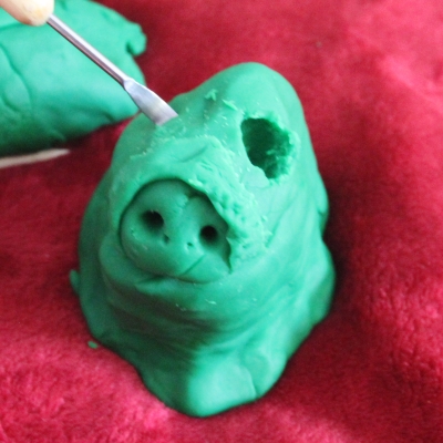 13/14. Use a scooping tool to excavate two large holes for the eyeballs