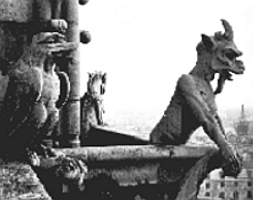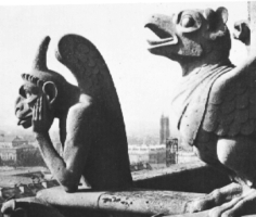 Gargoyles are sculptures that sit on the corners of old buildings in Europe. They were originally used to direct rainwater away from the building. They later became purely ornamental. An ornamental gargoyle is called a grotesque.