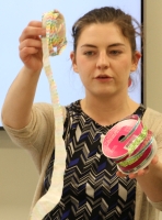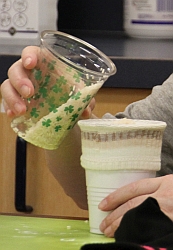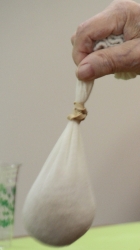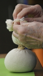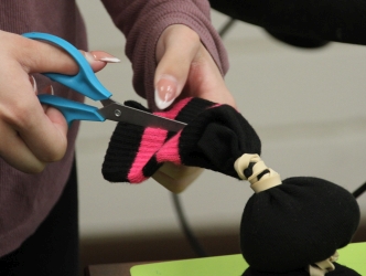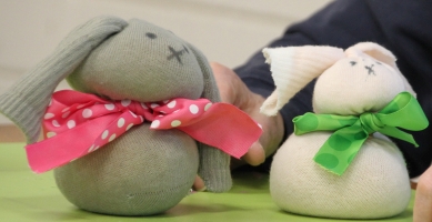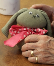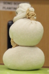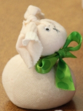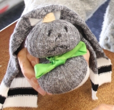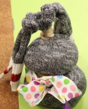 ![]() ![]() You'll need a sock (preferably clean, but if you're making skunks, used unwashed ones might be a creative embellishment). You'll also want lots of rice, some small elastics, markers, ribbons, and large plastic cups. You might also need some fast-drying glue. ![]() ![]() There are various ways of getting the rice into the sock without making a mess; one way might be to have students work in pairs and use a funnel. We chose to stuff the sock into the bottom of a plastic cup and peel the top of the sock back over the rim of the cup, as our instructor is demonstrating at the right. Then you can pour the rice right into the sock. Wrap it tightly with an elastic, right above the body. ![]() ![]() Once again, you could do this with a funnel, but we chose to use the plastic cup again. Stuff the filled bottom of the sock into the cup, and peel the top of the sock sock back over the cup rim. Now you can pour rice directly into the sock. Remember: less than last time! ![]() ![]() If you used an elastic here that was too big or wide and it shows, don't worry ... the ribbon will hide that. Some people chose not to tie an elastic above the head, but tied the ears instead. We'll show that below. By the way, if you're making a bear or skunk, you can disguise the elastics by painting them with a dark brown or black permanent marker. If your animal is like a skunk and has a big tail, you could reverse what we've done so far, by making the first ball smaller than the second. Then the left-over piece of sock will become the tail! ![]() For a bear, don't do that. Instead, cut off most of the sock above the elastic; just leave enough to fold back onto the head. Glue it in place. Then pull out and away from the rice two small sections of sock on either side of the head, and tie them off with small elastics. Ears! If the left-over sock is a tail, don't cut it at all; instead, stuff it with something soft like cotton balls and sew up the end. Use your imagination. ![]() ![]() Now add some eyes and a nose with a marker. If you can find a corn broom, remove a few strands and stick them beside the nose as whiskers. Have a look at some finished bunnies below. ![]() ![]() ![]() ![]()