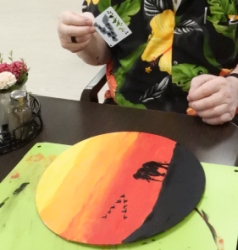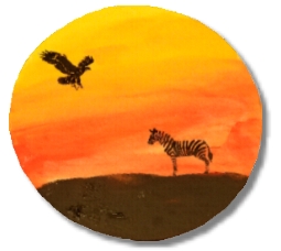 ![]() ![]() The first step is to cover the wood with paint mixed with water in horizontal strips. These don't have to be precise, and can be blended together. The aim is to simulate an evening sky. We chose an African theme (right). ![]() ![]() ![]() ![]() ![]() ![]() Since the painting will be a silhouette, the bottom strip will represent the land, and should be black. After completing the sky and ground, allow the paint to dry thoroughly; this could take 15 minutes or so. The final step is to apply the stencilled images of the amimals you've chosen, using black paint and a small brush. The paint should be used as is, without adding water. Hold the stencil firmly in place (it helps to have a second set of hands) and be careful not to paint outside the stencil. (If that happens, you can easily fix things by repainting the affected portion of the sky with more paint and water). The finished scene can easily be hung on a wall to display your creativity! |