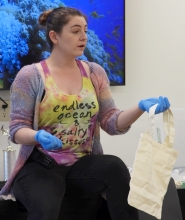 The materials used, in addition to bags and table coverings, are disposable gloves, aprons, elastic bands, and RIT fabric dye. The dye was transferred to squirt bottles to make it easy to apply.