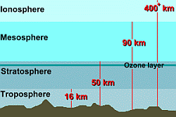 Nitrogen: Nitrogen gas (N2) makes up 78% of our atmosphere. Nitrogen is an element which is essential for growth and reproduction in both plants and animals. It is found in amino acids that make up proteins in our bodies, in nucleic acids that comprise our hereditary material called DNA, and in many other organic and inorganic compounds. Atmospheric nitrogen is converted to nitrate (NO3) by lightning. Organic nitrogen compounds are released to the atmosphere when plants decay. Also, industrial pollution and fossil fuel combustion release gaseous nitrous oxides and nitric acid (one component of acid rain). Atmospheric nitrogen in these various compounds makes its way into the oceans and onto land dissolved in rainfall. Oxygen: The gas oxygen (O2) is made up of oxygen molecules, each of which composed of two oxygen atoms. It is colourless, odourless, and tasteless. Oxygen makes up 21% of the air around us, but it also comprises 86% of the oceans and 60% of the human body (since every water molecule contains one oxygen atom), and is the third most abundant element found in the sun, after hydrogen and helium. Almost all plants and all animals require oxygen for respiration to maintain life. When you breathe air in, 21% of that breath is oxygen. Your lungs extract some of that oxygen, and replace it with some carbon dioxide, and so the air you breathe out has a little less oxygen and a little more CO2 in it. (It's important to note that the air you breathe out still contains oxygen ... otherwise mouth-to-mouth resuscitation wouldn't work!) Pure oxygen is very reactive gas, and combines easily with many other subtances to form 'oxides'. A very common oxide is rust, which is what you get when oxygen reacts with the iron in steel. The rate at which oxidation occurs varies with the element with which oxygen is reacting. Rust, or iron oxide, forms relatively slowly. Burning or combustion, however, where oxygen combines with substances in fuel, involves a very rapid oxidation. The carbon in wood, for example, can be quickly oxidized to carbon monoxide and carbon dioxide, with lots of heat given off. In the stratosphere, oxygen molecules combine with free oxygen atoms to form ozone (O3). This ozone gas collects in a thin layer near the top of the stratosphere. Ozone absorbs ultraviolet radiation from the sun, and protects life on Earth from its damaging effects. But there isn't much of it ... if all the ozone in the stratosphere was compressed to ordinary pressure at ground level, it would occupy a layer only 3 mm thick. That's why holes are appearing in the ozone layer due to chemical reactions with pollutants. The sun heats the surface of the Earth unevenly, so that in some places it is warmer, while in other places it is colder. Air closest to the Earth's surface is usually the warmest, and air temperature drops as you go higher. Warmer air close to the surface is less dense, so it rises. Cold air, which is more dense, sinks. As warm air rises, air from cooler areas flows in to take the place of this heated air. This process is called convection and causes air to move, creating wind. A History of Earth's Atmosphere: ![]() Earth's was replaced by compounds outgassed from the cooling crust, such as carbon dioxide, water vapor, sulphur dioxide and nitrogen, or perhaps from impacts of comets rich in gaseous materials. Life forms on Earth have since modified the composition of the atmosphere. In particular, oxygen was first produced by cyanobacteria (blue-green algae) about 2 billion years ago. All the oxygen in Earth's atmosphere is believed to have come from photosynthesis. The vast majority of this oxygen production now occurs in our oceans, by algae and bacteria. Plants and animals use the oxygen and produce carbon dioxide. Without plants, from algae to the trees in the rainforests, there would be no photosynthesis. Without photosynthesis, the oxygen in the atmosphere would be gone in a few thousand years. |