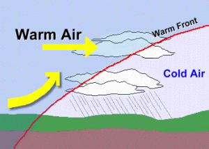 Weather can change quickly, and it is due to the movement of air masses in the atmosphere. An air mass is a large chunk of air ... often many tens of miles wide ... that shares the same temperature and humidity. When two different air masses meet, the boundary between them is called a front, and bad weather is usually the result. The principle that causes storms is a simple one ... when air rises, it expands and cools. Cooling occurs at the rate of about 10°C per kilometre. The water vapour in the air soon condenses into water droplets, which form clouds, and eventually these droplets fall from the sky as rain. Storms can occur when two very different air masses meet. Let's look at two possibilities. ![]() ![]() This happens when a fast-moving mass of cold air hits a warm air mass. The warm air, which holds a lot of water vapour, gets pushed upward. The water vapour condenses to water droplets, which form tall clouds. Eventually the weight of the drops can no longer be supported by the air, and they fall. This type of storm is often violent, with a lot of thunder and lightning, and heavy rain in a short period of time. But it ends quickly. ![]() A warm front happens when a fast moving mass of warm air encounters a cold air mass, and rides up on top of it. The warm, humid air eventually rises high enough for water droplets and clouds to form, and rain to fall. This type of storm usually covers more area, lasts longer, and will produce a steady rain for a long period of time. Thunder and lightning often accompany the storm , but of a less violent nature than in a cold front. ![]() You can see this effect in the Rocky Mountains. The wind come from the west, where it has picked up a lot of moisture from the Pacific Ocean. As it rises over the Rockies, water vapour condenses and falls as rain. The west side of the Rockies gets a lot of rain. By the time the winds reach the far side, they're dry ... the foothills there get very little rain. Air Pressure You probably know that a barometer measures air pressure, and can tell you something about what the weather is going to be like. Rising air pressure means good weather is coming, and dropping air pressure means that bad weather is on the way. Here's the explanation. Air masses are constantly moving. In some places air is going up; in other places it is falling. In between, air is moving parallel to the surface ... causing winds. When you are experiencing low pressure, it usually means that air above you is rising, and expanding. This rising, expanding air will cool, forcing its water vapour to condense, clouds to form, and maybe rain to fall. If you are experiencing high pressure, it probably means that the air above you is falling, and compressing. As this air falls, it gets warmer. This means it can hold more water vapour, so any clouds that exist will evaporate, leaving a clear sky. |