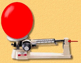 First, attach a piece of tape to the pan of the balance. You'll be sticking the balloon to this, later. Put the uninflated balloon on the scale too. Balance the scale so the indicator is centred.