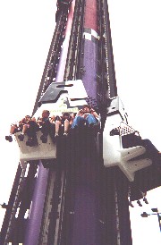 ![]() I don't uderstand why anyone would want to do this. Then the brakes fail, and your chair plummets downwards in free-fall. A second or so before you are about to become a layer of jelly on the pavement below, the chairs come to an abrupt but smooth stop. We have some old pictures of Jesse and Emily on this ride, so we though we'd look at the equations of motion for falling bodies, as studied in Physics 20. Notice especially the look of rapt anticipation on the faces of the riders. Needless to say, the expressions after the ride was over were considerably different. (The words 'white' and 'sheet' come to mind). We weren't allowed to show you that picture. Anyway, the tower is 29 stories tall, which makes it close to 290 feet tall, or about 88 metres or so. The main formula used for falling objects is the following: ![]() d is the downward distance of feefall vi is the initial downwards speed, which is 0 m/s, so the formula can be rewritten: ![]() g is the acceleration due to gravity, which is 9.8 m/s2 downwards. We have an approximate value for t, the time of freefall; we estimated 3 seconds. This means we can work out how far the seats fell: ![]() In other words, the ride lets you fall a distance of only about half of the tower's height. The rest of the distance is made up by the supporting mechanism at the top (you aren't quite the full 290 feet up when at the top ... maybe only 250), as well as the distance required to brake, bringing you gently to a stop. Nevertheless, the experience of falling is very real, ... especially if you manage to do it with your eyes open! |