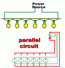 ![]() Amazingly, very few of the bulbs anywhere were burnt out ... dead ones must be replaced every day! The large arrays of light bulbs of course immediately suggested the difference between series and parallel circuits, and why all the lights on a ride don't go off if one light burns out. Let's look at the difference. ![]() Here's a simple series circuit, made from a single wire, where the electricity can flow in a complete path ... from the power source, around the wire, and back to the source. In order for this circuit to function, the path that the electicity follows must be unbroken. This means that if a single bulb burns out, the circuit will be broken, and the entire string of bulbs will go out. Clearly, a series circuit is not very useful if you have more than one object that needs electricity. When a bulb blows, you would have to test every single bulb on the circuit to find the one that is broken. ![]() Here's the way most circuits are set up. This is called a parallel circuit. You probably know that most electrical wiring is composed of a double strand of wire. This creates a complete circuit path that can follow any one of the branches, or all of them. The electricity flows through each bulb on a separate branch of the circuit. In a parallel circuit, the bubs are on separate paths, that look like rungs of a ladder. If one bulb blows, the electricity can't flow through that branch of the circuit. But it can still flow through all the other branches! The result is that a dead bulb will not cause the entire circuit to stop working, and the one bulb that isn't receiving electricity can be easily identified and replaced. |
