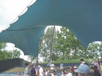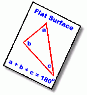 In a Triangle ![]() What do the three angles in a triangle add to? You may think you already know the answer to this question. The angles add to 180°, right? In fact, you only know part of the answer. The angles in a triangle only add to 180° sometimes! Under certain conditions they add to more than 180°, and sometimes less. Let's look at why. ![]() The situation with which you are familiar is the one where a triangle is drawn on a flat surface, called a plane. Such surfaces, like the page in your math notebook, are perfactly flat. They are described by saying they have zero curvature. Whenever you draw three straight lines to form a triangle here, the three angles formed will always add to exactly 180°. But there's no reason we have to draw the triangle on a flat surface ... ![]() Suppose instead we draw the triangle on a sphere. Using a flexible ruler, we draw three straight lines on the surface of a sphere, and then measure the angles. We discover that the sum of those three angles is greater that 180°! This is not a trick. It's difficult to show on a page like this, so we urge you to get a globe or large ball, and draw three straight lines with a ruler, that connect. Measure the angles. You will find for yourself that the angle sum exceeds 180°. This is because a sphere has positive curvature. This is a very important fact. It means, for instance, that triangular paths drawn across the surface of the earth that are long enough to follow the curvature of the earth (which is very nearly a sphere) will total more than 180°. ![]() On a flat map of a region of the earth, as shown on the right, you might assume that the shortest distance between points A and B is shown by the straight line joining them. If in fact the earth were flat, this would be true. But the earth's surface is not flat ... it is the curved surface of a sphere. The shortest distance is the arc (centred at the centre of the earth), shown in white. This is called a 'great circle', the path flown by airplanes to cover the least distance from A to B. ![]() Now locate and mark points A and B and the in-between points on a large globe, and draw the same path. You will see that this path is longer than the path directly from A to B along the surface of the globe. If you locate points along that line on the globe, and transfer them back to the flat map, you will get a curve. Is there a condition uder which the angles in a triangle add to less than 180°? ![]() Yes there is. This will happen on a surface which has negative curvature. An example is the inner curve of a saddle-shaped surface, as shown on the right. Triangles drawn on this surface will have three angles that do indeed add to less than 180°! ![]() This fact is important whenever shapes with negative curvature are constructed ... large stadium roofs, for example. |