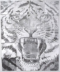 Here's a completed Wildcat made by the 2002-3 grade 5/6 class! The detail in all the squares (without students seeing the neighbouring squares or the whole image in advance) was excellent, although some students had difficulty matching the black level. Students were very pleased with their result.