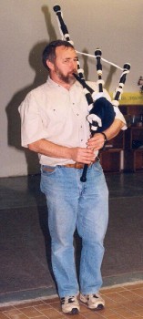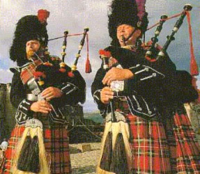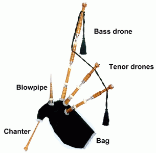 ![]() ![]() ![]() The pipes were later popular in all of Europe during the Medieval and Renaissance periods. Early pipes were made from animal skin, with hollow leg bones of small animals attached; holes drilled into the bones allowed musicians to produce various pitches and tones. The bagpipes were introduced to Scotland from Ireland. The Scots added a third drone (see below) and applied their own tartans to the bags. Village musicians may have first used the bagpipes and drums to entertain. The pipes were also played at funerals. Bagpipes were used by the Scots in battle against the English probably because the English found them to be disturbing and unsettling. (Eventually the English banned the instrument, along with other traditions that they felt were threatening). On this page we'll look at Scotland's Great Highland Bagpipes. ![]() The pipes were originally made of a hardwood, such as ebony, and decorated with ivory or silver. Today's pipes are usually made of less expensive wood, or plastic resins. The piper breathes air into the blowpipe to keep the bag full. The blowpipe has a one-way valve so air can't get back out that way. The bag is then squeezed under the arm to force air out of the other four pipes. Three of the pipes are called drones - two tenor and one bass. These lay across the piper's shoulder and produce the constant humming sound. The last pipe is the chanter; held in the hands, its holes allow a melody to be played with the fingers. ![]() The chanter and drones contain vibrating reeds like other wind instruments; the chanter reed is double-bladed, so it's the loudest. The chanter has eight holes which are covered by the player's fingers. It works just like a flute; if some holes are uncovered; the length of the vibrating air column inside is shortened, raising the pitch. The chanter has a bell-shaped flare at the bottom like a trumpet, which also helps produce a louder sound. The drones - the long pipes that rest on the shoulders - each have only one hole at the end, so each plays just one note. The bass drone is one octave below the tenor drones, which are in turn one octave below the chanter. The upper sections of the drones are built so that they can slide in and out; by altering their length they can be tuned. By lifting one of the fingers on the chanter very quickly, a small 'blip' of sound at a higher pitch is created; this is used to separate notes, so that the rhythm of the melody can be heard. This and other techniques make the bagpipes difficult to play well, but give the music its distinctive sound. Scotland the Brave | Amazing Grace | Tura Lura |