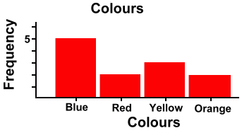 ![]() A bar graph shows you the frequency of each element in a set of data. The height of each bar represents how many of that data element there are. Here's an example. Suppose we bought a small box of Smarties and counted how many of each colour was in the box. We might get results as shown in the table below left. We could then record the frequency of each colour in a bar graph, as shown below right.