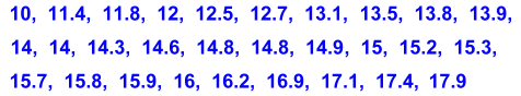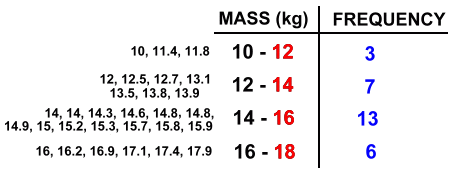 Bar graphs are used to represent the frequency of discrete items. They can be things, like colours, for which there is no particular order. Or they can be numbers, like allowance amounts, where they can be put into order if you choose to. But (this is the important part) the items are not grouped, and they are not continuous. We'll show you what we meant by that last sentence, in the example below, where we show you a set of data that we will group, and display in a continuous manner on a histogram. Suppose we were surveying the masses of fish in a lake, and we caught and weighed twenty-nine fish. We recorded their masses (in kilograms). Below is the data we might have collected. ![]() If you examine the data above closely, you'll see that there are a lot of mostly different numbers. It wouldn't make much sense to make a bar graph showing the frequency of each individual mass, since most of the bars would just be one ot two units high, and there would be a lot of bars. Instead we're going to group the data. Grouping means to count how many masses there are in different weight categories, or classes. For example, how many fish had a mass between 10 and 12 kilograms? The answer is three. They were 10, 11.4 and 11.8 kg. Note that we don't count 12 in this class of fish. We're defining 'Between 10 & 12 kilograms' to mean 'everything from 10 up to 12, but don't count 12' Below is our grouped frequency table. We've shown (on the left) which masses went into the count for each class. We also indicated the upper bound of each class in red, to remind you that this value isn't counted in that class. ![]() By grouping the data this way, we accomplish several things. First, there will be fewer bars on the graph, and the bars won't all be showing just one or two items. Second, we've made a continuous range of masses. all the way from 10 to 18 kilograms, and every possible mass we could obtain must fall somewhere in this range. Also, because each class runs right up to the next one without overlap and without leaving out any values, the bars must touch. Here's the histogram: ![]() This graph is a histogram, but not just because the bars touch. In the bar graph example at the top of the page, you saw that bars in a bar graph can touch if you want them to ... but they don't have to. Touching bars in a bar graph doesn't mean anything. In a histogram, however, the bars must touch. This is because the data elements we are recording are numbers that are grouped, and form a continuous range from left to right. There are no gaps in the numbers along the bottom axis; every possible fish mass can be located in one of the classes. This is what makes a histogram. ADDITIONAL NOTE: The material on this page follows the Alberta Junior High Math 8 curriculum. There are of course other ways to define and set up classes, and more rigorous definitions of histograms. |