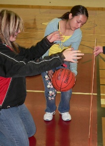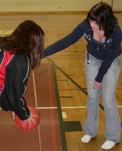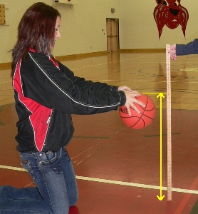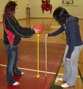 ![]() ![]() There are a variety of ways to measure a basketball's bounce; we'll show you one way here that uses nothing more complicated than a metre stick and the use of square roots and a calculator. In order to measure a ball's bounce, you must drop it from a measured distance, and then record the distance to which it rises after it bounces. Since the surface you bounce it on will also affect how high it bounces, you should do the test on a basketball court floor. We tested a variety of basketballs, some in good condition and some not so good. We'll show you how to make the calculation. First you must measure the distance that the ball falls. We'll call this the height down, or hdown. This is measured from the bottom of the basketball to the floor, as shown in the picture at the left below. Next, measure the distance that the ball rises after bouncing. We'll call this the height up, or hup. This is measured from the floor to the top of the basketball, as shown in the picture at the right below. (The person doing this had her hands ready to catch the ball at the top of its rise, to make measuring easier) ![]() ![]() Here's the formula for calculating the bounciness of the basketball. Bounciness is referred to as the coefficient of restitution, and we'll call it C. ![]() We did the experiment a number of times, on a variety of balls. Here is one result we got: for a drop of 100 cm, the ball bounced back up to 61 cm (measured to the top of the ball). Let's work out the coefficient of restitution for this ball: ![]() According to one source we found, an official basketball should have a coefficient of restitution of between 0.76 and 0.80, so the ball shown above was a good one. Surprisingly, some of the balls had a value of C that was higher than 0.80; we couldn't find an explanation for why a ball that is too bouncy could not be an official ball. ![]() ![]() ![]() |