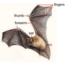 Bats share characteristics of all mammals - hair, regulated body temperature, bearing their young alive, and nursing them. Infants grow rapidly and are able to fly in about three weeks. Bats are the only mammal that can truly fly. The structure of their wing membranes, the arrangement of the bones supporting them, and the positioning of the muscles provide bats with the lightness and maneuverability necessary for catching insects, hovering above flowers, or avoiding obstacles. The bones of the arm and the fingers are light, slender, and lengthened to support, spread, and manipulate the membrane. The thumb, usually with a sharp claw, is not attached but remains free for clinging to various surfaces.
