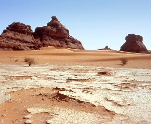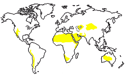 ![]() ![]() There are few plants that can grow here; the ground is bare during much of the year. With little surface material available to retain the heat from sunlight, the nights are quite cold. Plants that exist here are able to retain water, both by storing it in their tissues and by preventing its loss, through adaptations like thick waxy skin and thorns to ward off animals. Animals also are adapted to the heat and dry conditions; many are active only at night, and those that are out in daytime are able to conserve water. The camel, for example, maintains a supply of water bound into the fat in its hump(s). Other creatures can exist with little need for water intake. ![]() ![]() Plant life includes succulent ('water-rich') plants like cactus, as well as plants that are tolerant of little water, like sagebrush and mesquite. Animal life includes millipedes, centipedes, spiders, snakes and lizards, as well as goats, sheep, coyotes and camels. There are also running birds like the roadrunner and ostrich, as well as bats and other small mammals. In the few locations where ground water is available, the vegetation may be more lush; these areas are called oases. |