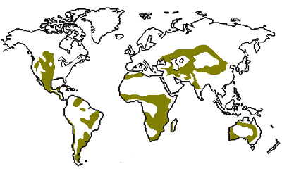 ![]() ![]() There are two types: prairie grasslands (where temperatures are moderate) and savanna grasslands (where temperatures are warmer). Most of these regions endure dry spells during the year; prairies during the winter, and savannas during the summer dry season. Due to warmer temperatures and abundant grasses, many varieties of wildlife are supported by the grassland biome. ![]() ![]() ![]() Prairie grasslands are common in North America, although many have disappeared, to be replaced by agriculture. Prairies have warm summers and cold winters. While grasses predominate, there are also varieties of flowering plants and a few trees. Native wildlife includes antelope, buffalo, deer and many species of small mammals. Savannas are grassland regions found in Africa, Australia and Central and South America. They are warm year-round, but often have two seasons based on precipitation: wet and dry. Native wildlife includes many of the largest species on Earth, such as elephants, the hippopotamus, giraffes, lions, cheetahs, and wildebeest. In both types of grassland, living things are adapted for survival in dry periods. Grasses have large root systems. Large animals can travel long distances to graze on whatever is available. Small animals burrow to escape the cold of winter and the predators of summer. Humans make use of the regions by growing crops (varieties of grasses, such as grains) or raising animals that can be fed these grasses, such as cattle. |
